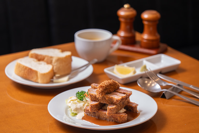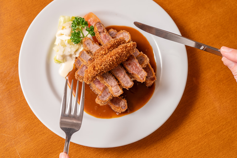 姫路城観光の方におすすめなのが、「3回楽しめる"姫路城"牛カツ」。日替わりスープ・パン又はライス付きで180g 4,180円(税込)