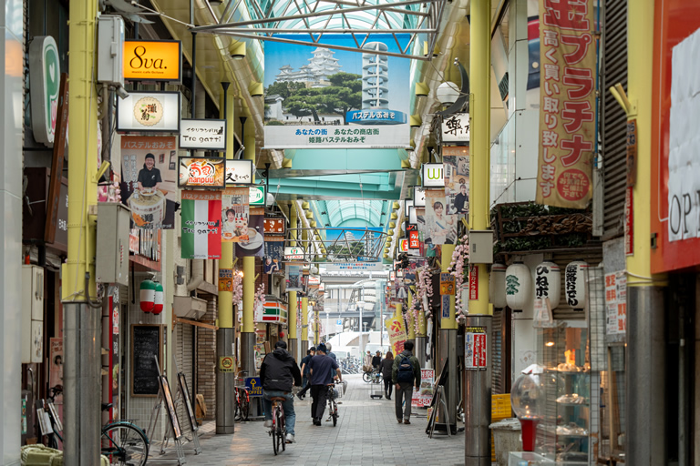 姫路駅から姫路城に向けて一直線に伸びる「みゆき通り商店街」の一本東、「おみぞ筋商店街」にあります。綾瀬はるかさん主演の映画『ルート29』にも登場した商店街です。