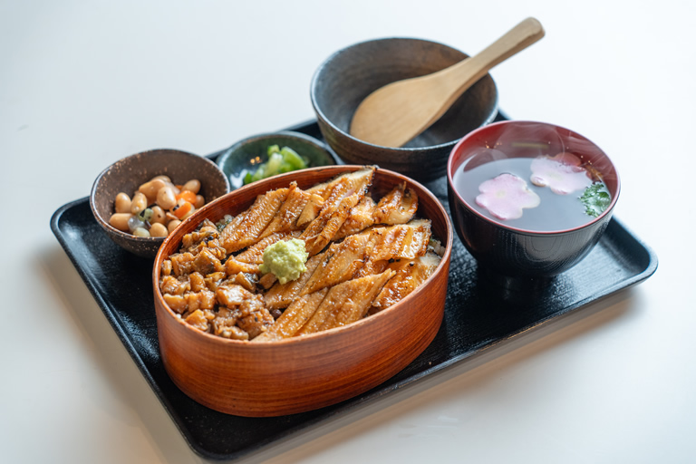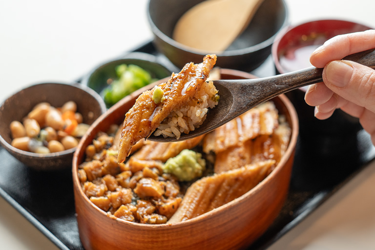写真は、蒸しあなごに加え、炭火で焼き上げた焼きあなごと、山椒をきかせたあなごの佃煮という、3つの味のあなごが食べ比べられる「あなごわっぱ」2,900円(税込)。