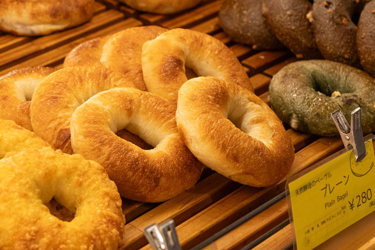 看板メニューの一つがベーグル。定番から季節限定まで毎日10種類ほどが並び、北海道産小麦粉「はるゆたか」と天然酵母を使った生地はもっちもち。地元民にもリピーターがとても多くて、午前中に売り切れることがほとんど。