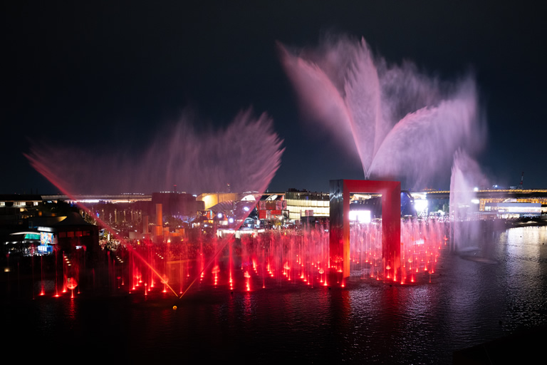 大屋根リングがライトアップされ、パビリオンも夜仕様になると昼とは全く違った雰囲気になります。噴水ショーやドローンによる光のショー、プロジェクションマッピングなど、夜限定のイベントだけでも満足度はかなり高いと思います』。