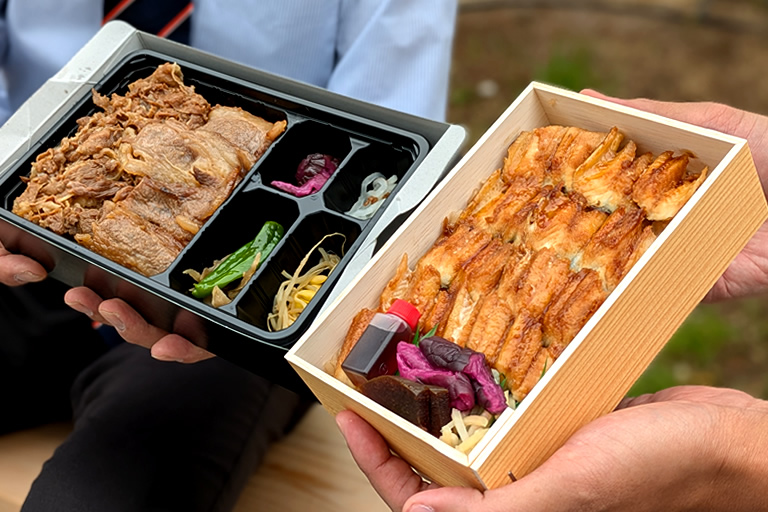 この日は、「まねき食品」の「神戸牛すき焼きと焼肉のあいのせ重」1,980円(税込)と「たけだの穴子めし」2,160円(税込)を購入して、店前の「静けさの森」のベンチでランチタイム。