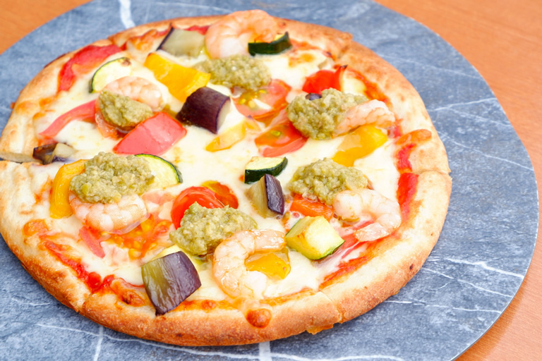 写真は、「朝倉山椒のタプナード」をトッピングした「朝倉山椒と小海老の夏野菜ピザ」1,250円(税込)。