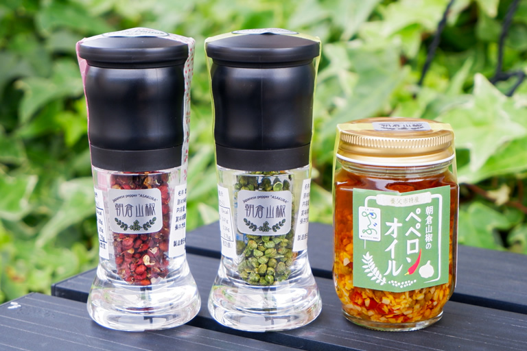 オリジナルの「朝倉山椒のペペロンオイル」810円(税込)、挽き立てが味わえるミル入りの「乾燥山椒」1,650円(税込)や「朝倉山椒(花椒)」1,540円(税込)も販売。