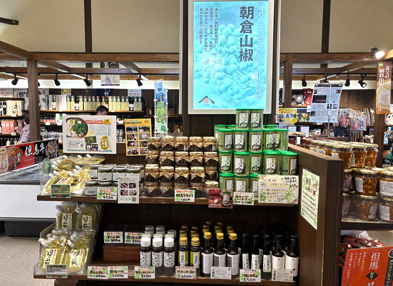 養父市の観光拠点の一つ「道の駅ようか但馬蔵」には、朝倉山椒のコーナーが3つもあり、加工品やスイーツが多数販売されています。
