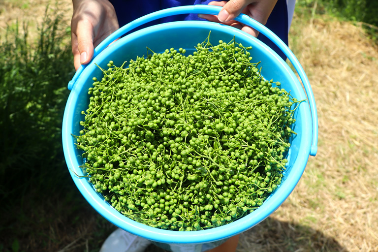 収穫後も手作業でゴミ等を取り除いて選別し、優しく水洗いし、熱湯で加熱処理後に出荷・保管されます。収穫から出荷まで一貫した管理体制なので、鮮度が高く、品質がとても高いんです。特に、「摘みたての生山椒」は、収穫後の2週間ほどしか販売されず、数も少ないため、現地でもなかなか手に入らないほど希少なんです。