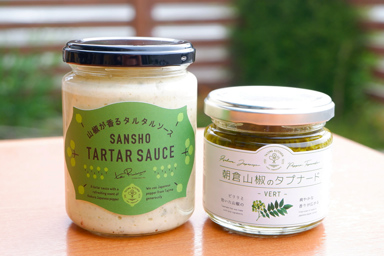 「カタシマ」では、朝倉山椒を使った2つのオリジナル調味料「朝倉山椒のタプナード」と「山椒が香るタルタルソース」を製造販売しています。