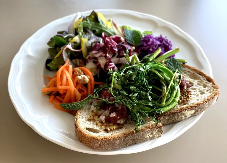 ▲ 地元産の新鮮な野菜がたっぷりの「鹿生ハムと戸部農場クレソンのオープンサンド」1,250円(税込)
