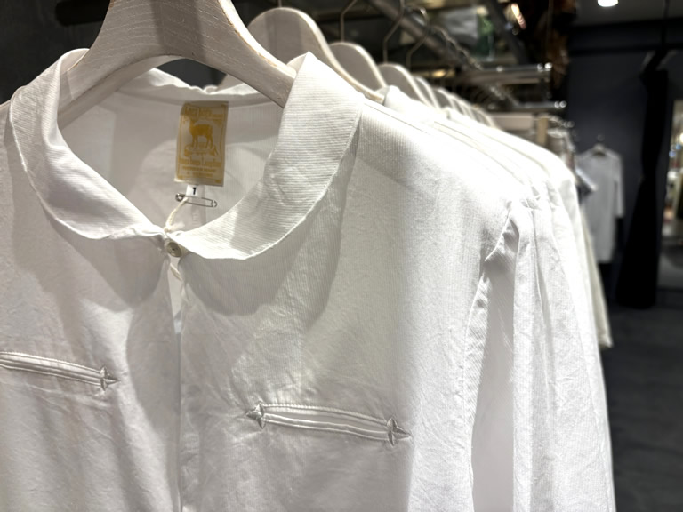 《平野さん談》『襟や両袖、両裾などに使用しているボタンがすべて野生鹿革のボタンなんです。鹿の皮を塩と菜種油で揉み上げ、天日にさらして仕上げる「姫路白なめし」という技法で加工して作っています』。