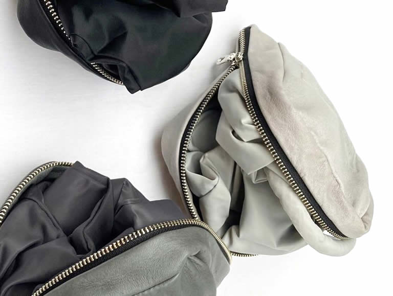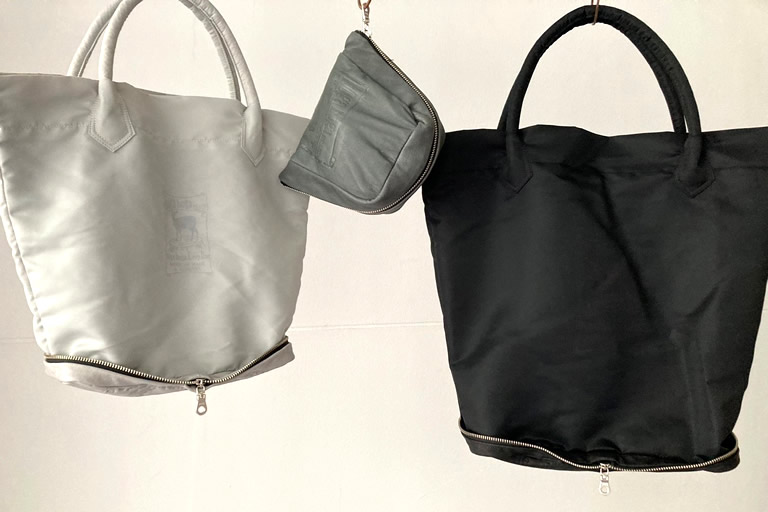 ▲ 底に鹿革を採用し、ボディ部は再生素材のリサイクルナイロンを使った便利な折りたたみ仕様のバッグ。Mサイズ26,180円(税込)L、サイズ29,480円(税込)