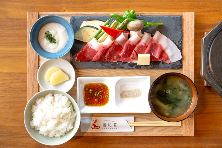 定番のぼたん鍋もとっても美味しいんですが、私のおすすめは、猪肉を焼いて食べる「石焼き猪肉御膳」2,000円(税込)。臭みがなく上質で柔らかな猪肉だからこそできる食べ方なので、ぜひ味わって欲しい逸品です。