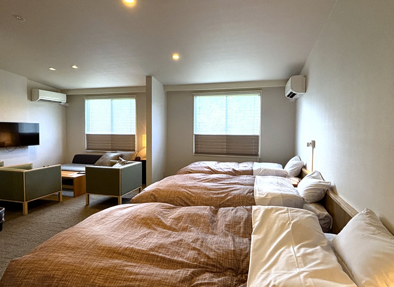今年2025年に一部客室がリニューアルされて、家族・グループで泊まれる4ベッドルームが3室登場。専用の四輪バギーが全室に用意されいてるグランピングもファミリーに好評だそう。