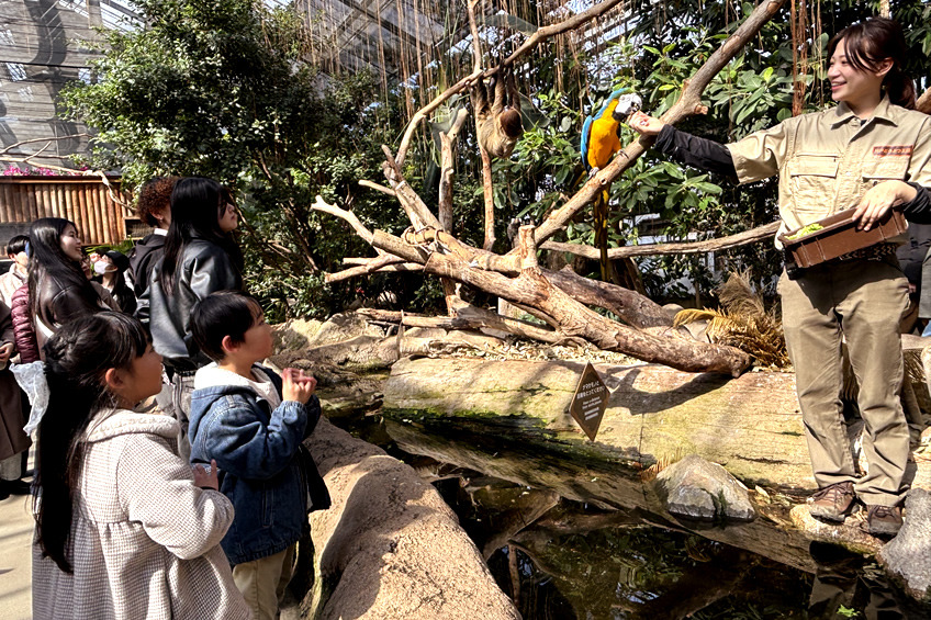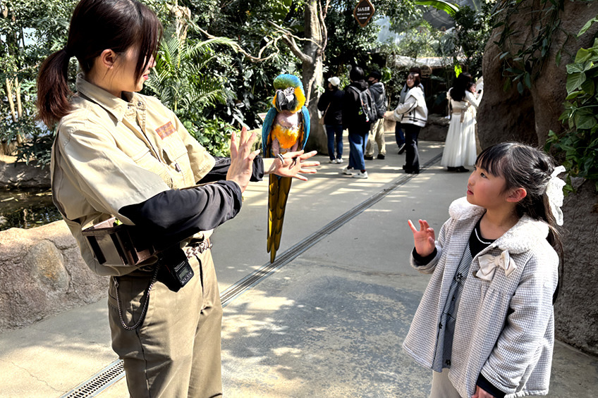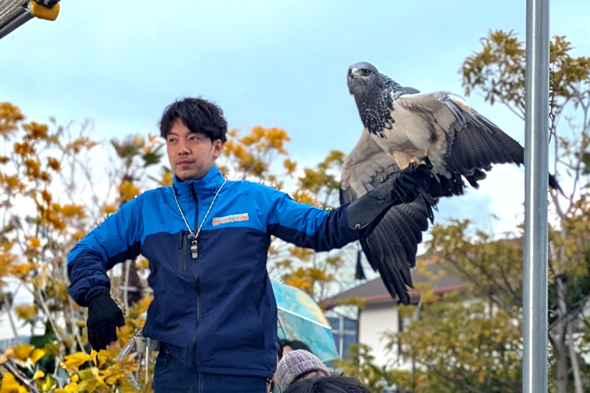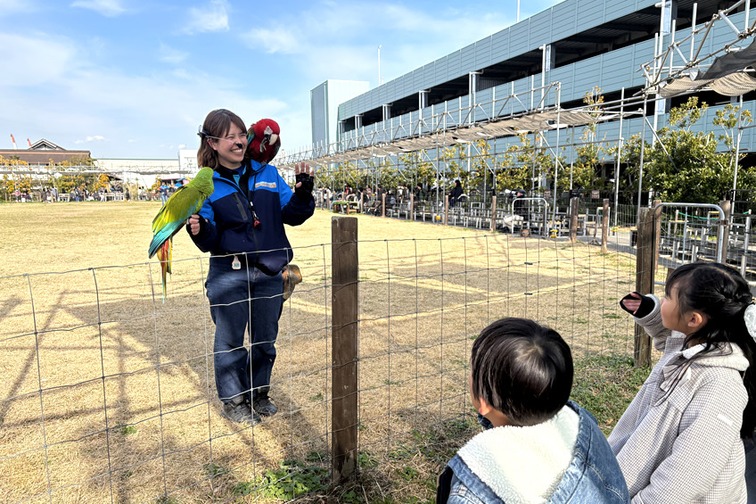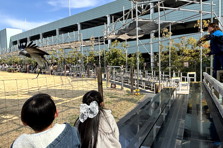 バードパフォーマンスは大迫力で、目の前をすごい速さで鳥が飛び交い、大人も子どもも大興奮。パフォーマンスの後、お見送りしてくれるスタッフ&鳥と記念撮影もできました。