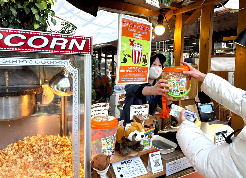 ⑪ おまけ情報:子どもたちに大好評のポップコーン。テーマパークのように食べながら園内を散策できるんです。※動物の近くに行く時は蓋を閉めるのがルール。