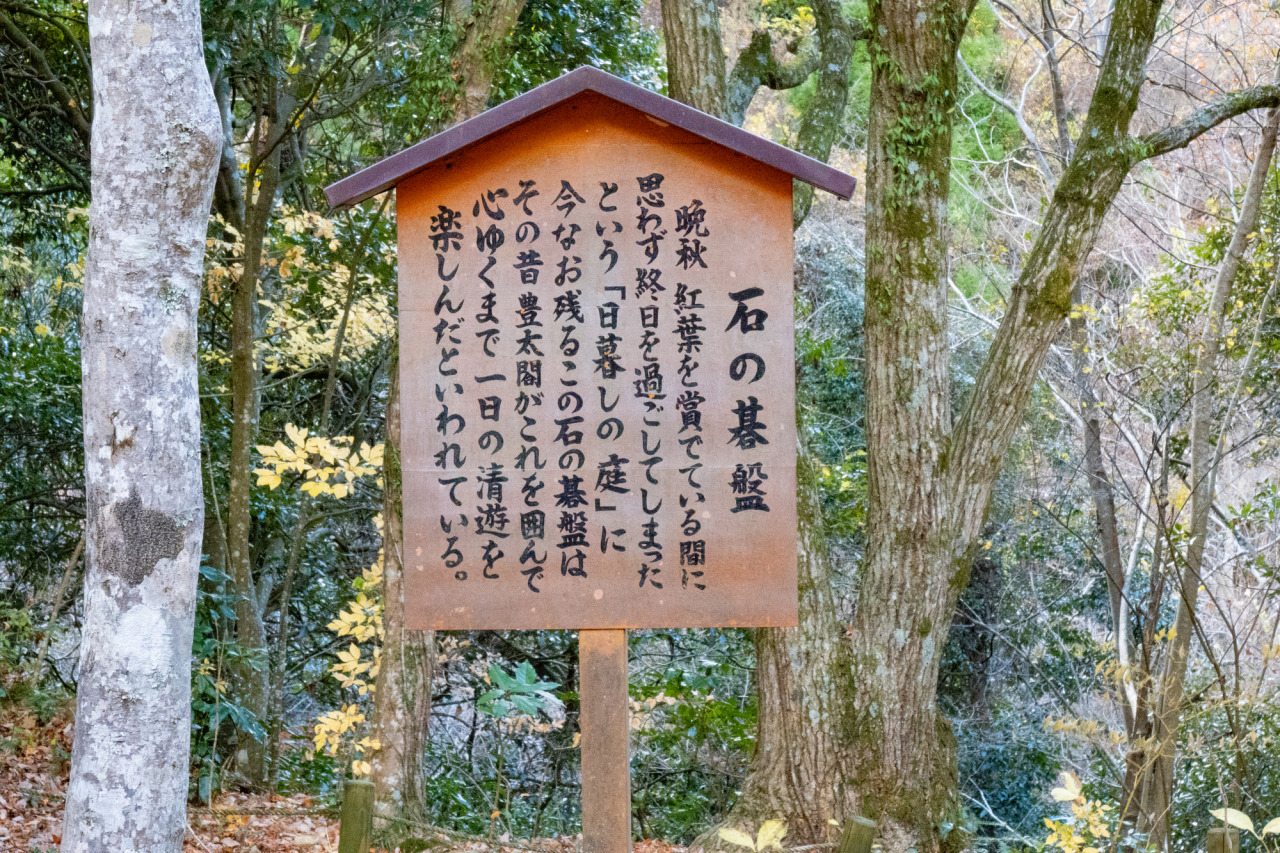 園内には、豊臣秀吉が愛用したとされる石の碁盤や百人一首の歌碑、伏見城から移築されたと伝わる旧瑞宝寺の山門など、歴史を感じさせるものが点在しています。また、毎年11月には秀吉を偲び、「有馬大茶会」の野点(のだて)も開催され、風情あるひとときを過ごせます。