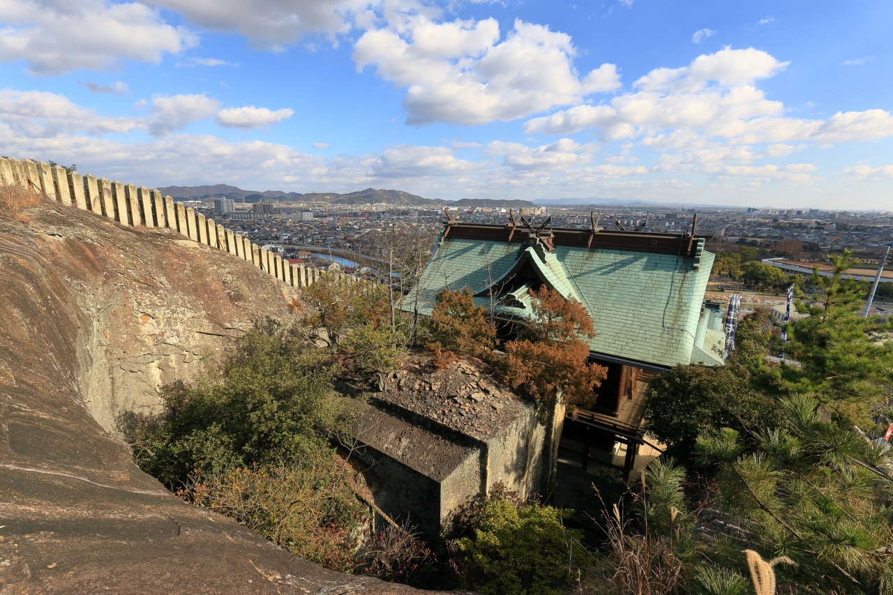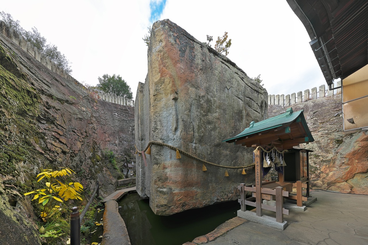 間近で見る石の迫力は圧巻ですが、社殿の裏山にある「山上公園」へと続く道から眺めると、石の宝殿の全体像がよく分かり、また違った角度から観察できるのでおすすめです。また、境内には石の宝殿の分岩といわれる霊岩もあり、「力を込めて押し、その手で身体の弱い部分を撫でるとご利益がある」と伝えられています。