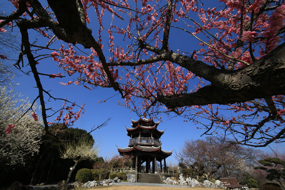 平成5年に開園した世界の梅公園。園内では日本・中国・台湾・韓国など世界の梅、約350品種を楽しむことができます。また、園内の建物は中国人の手によるもので、「いったいここはどこ?」と異国情緒ただよう雰囲気に異次元の世界も感じられます。展望台からは青い空と瀬戸内海が一望でき、西は赤穂御崎から四国、小豆島、家島群島までが眼下に広がります。