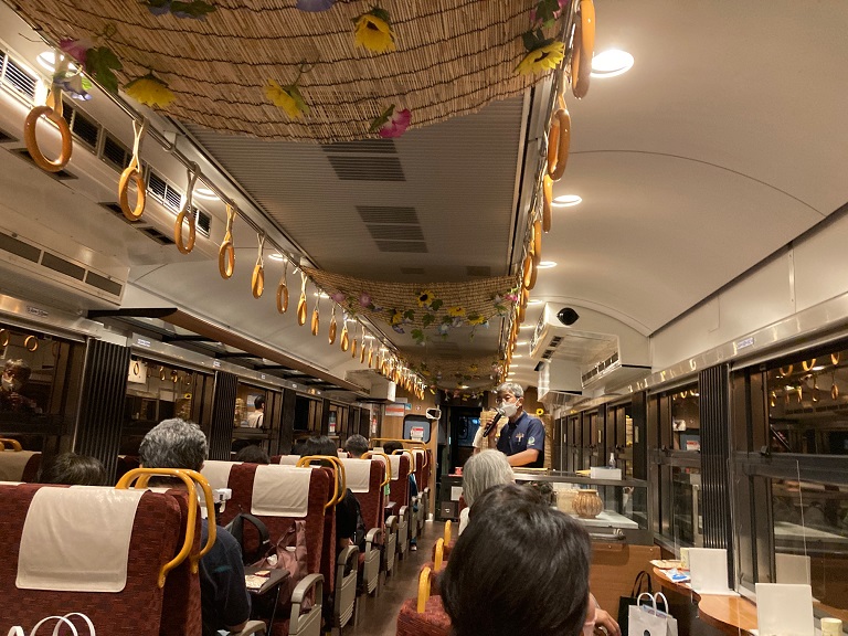 車内では旅の案内人による但馬の地産品の案内や、日本海の絶景をお楽しみいただきます。ビュースポットでは列車がゆっくり走るので美しい景色が満喫できますよ!