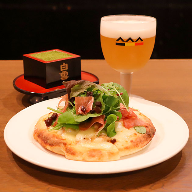 - 「酒粕ピザ」1350円(税込)、「日本酒ティラミス」560円(税込)、「KONISHIビール・スノーブロンシュ」750円(税込)