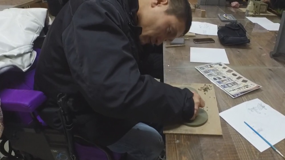 車いすをご利用の方も体験できる淡路瓦粘土彫刻体験は、様々な土の暖かさに触れることができます。