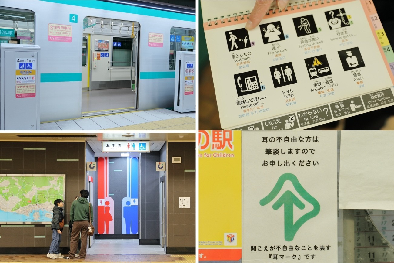 ベビーシート、オストメイト対応などの設備を集約した多機能トイレ「こうべ・だれでもトイレ」や、車椅子でも利用しやすいエレベーターを設置。コミュニケーションを支援する4カ国語表記の指差しボードも。