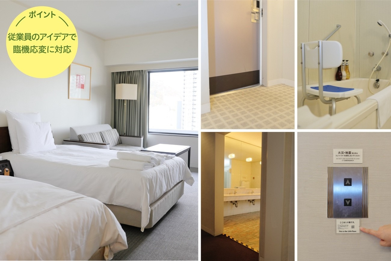 客室の扉には車椅子のフットレストを傷つけないマグネット式のクッションパネルをつけ、タオルやパジャマを車椅子でも手に取りやすい場所に配置するなど、細やかな配慮を実施。館内の3~5mmのわずかな段差に警告テープを設置し、エレベーターホールに階数をアナウンスする音声コードを導入するなど、アイデアをもってソフト面の対応を強化した。