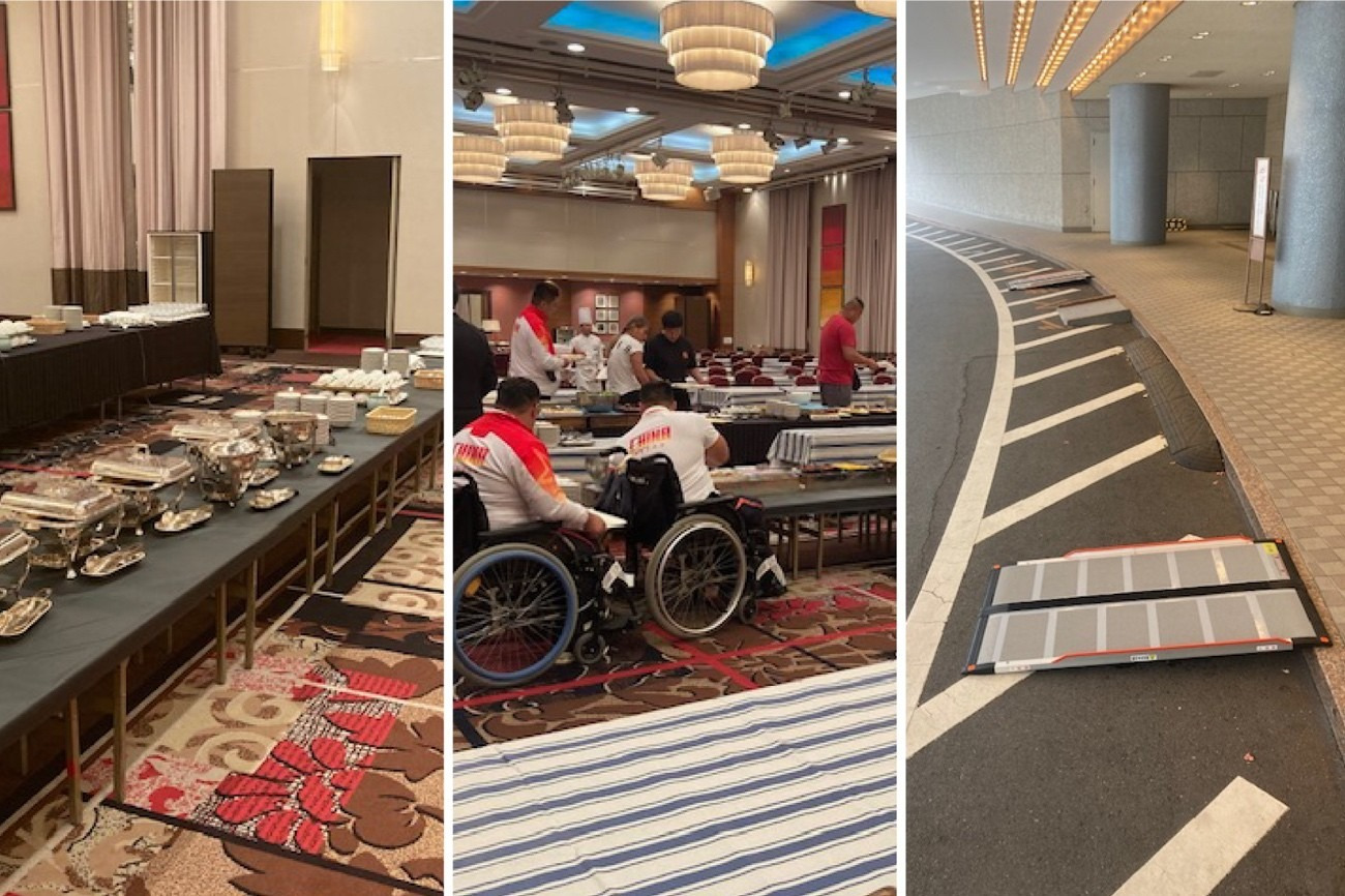 世界パラ陸上時は、朝、昼、夕方から23時まで食事会場を開き、いつでも選手が利用できるように。宗教や文化を背景とした食の多様性にも対応。玄関付近の小さな段差にもスロープを設置し、館内での車椅子移動をスムーズに。