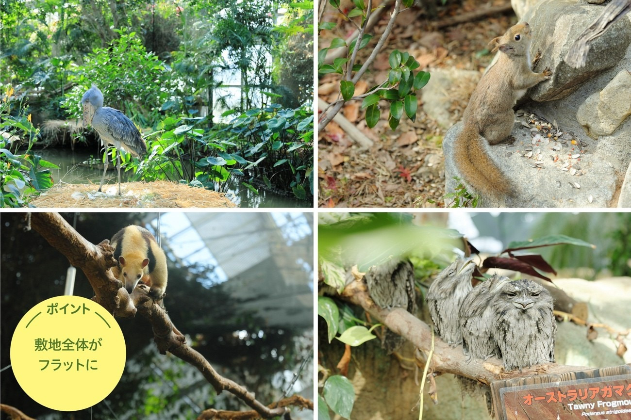 年間を通して豊かな緑と花が彩る屋内エリアの一番人気はハシビロコウ生態園。屋内・屋外と2つのエリアからなる園内はバリアフリー設計。オストメイト対応の多機能トイレも。群れで暮らしたり、擬態しながらお昼寝したり、木をつたって餌を取りに行ったりと、のびのび暮らす動物。見ているだけでほっこり。