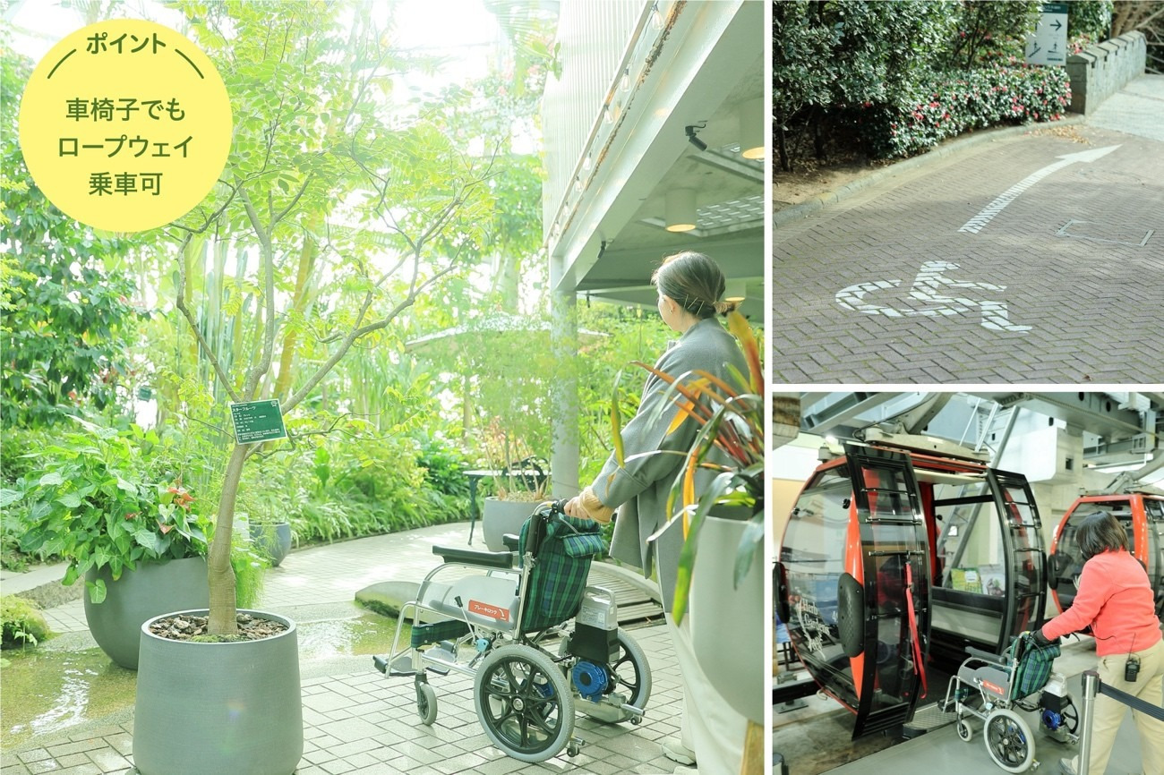 山麓駅と山頂駅をつなぐロープウェイのゴンドラはすべて車椅子対応。乗降の際はスタッフがアシストしてくれるので乗り降りもスムーズに。車窓からは神戸の港と街並みを一望する絶景が広がる。