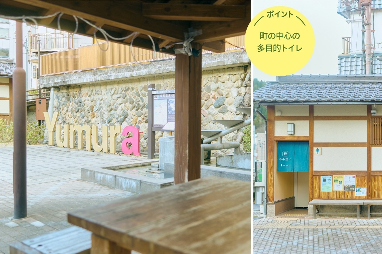 公共の多目的トイレは、ポケットパークのほか、東駐車場近くの「夢千代トイレ」も。