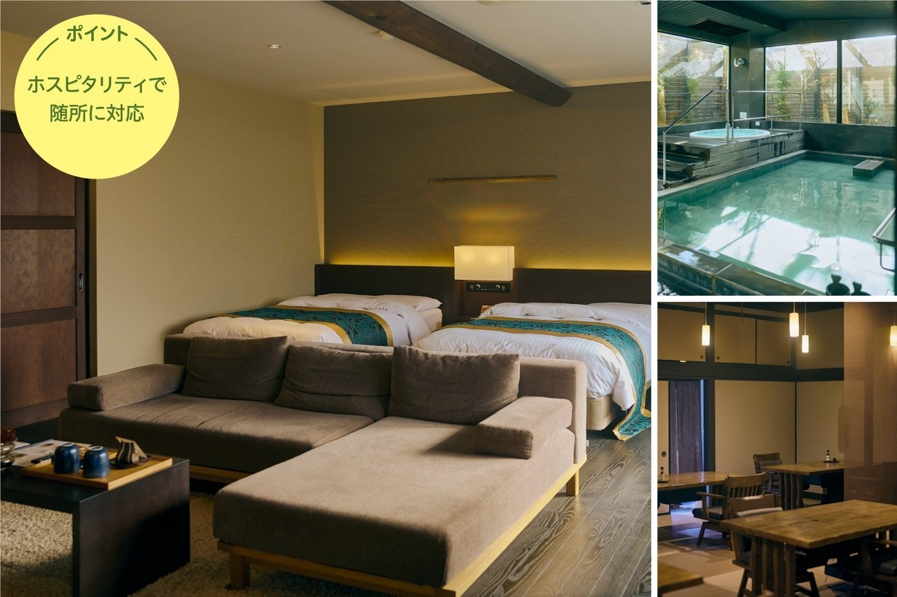 四つの自家源泉を保有することから豊富な湯量を誇り、大浴場をはじめ、全客室で掛け流しの温泉を贅沢に楽しめる。スタンダードな客室でも間取りは10畳以上と広々とし、ユニバーサルデザインを取り入れた客室も用意することから、家族3世代での利用も多い。