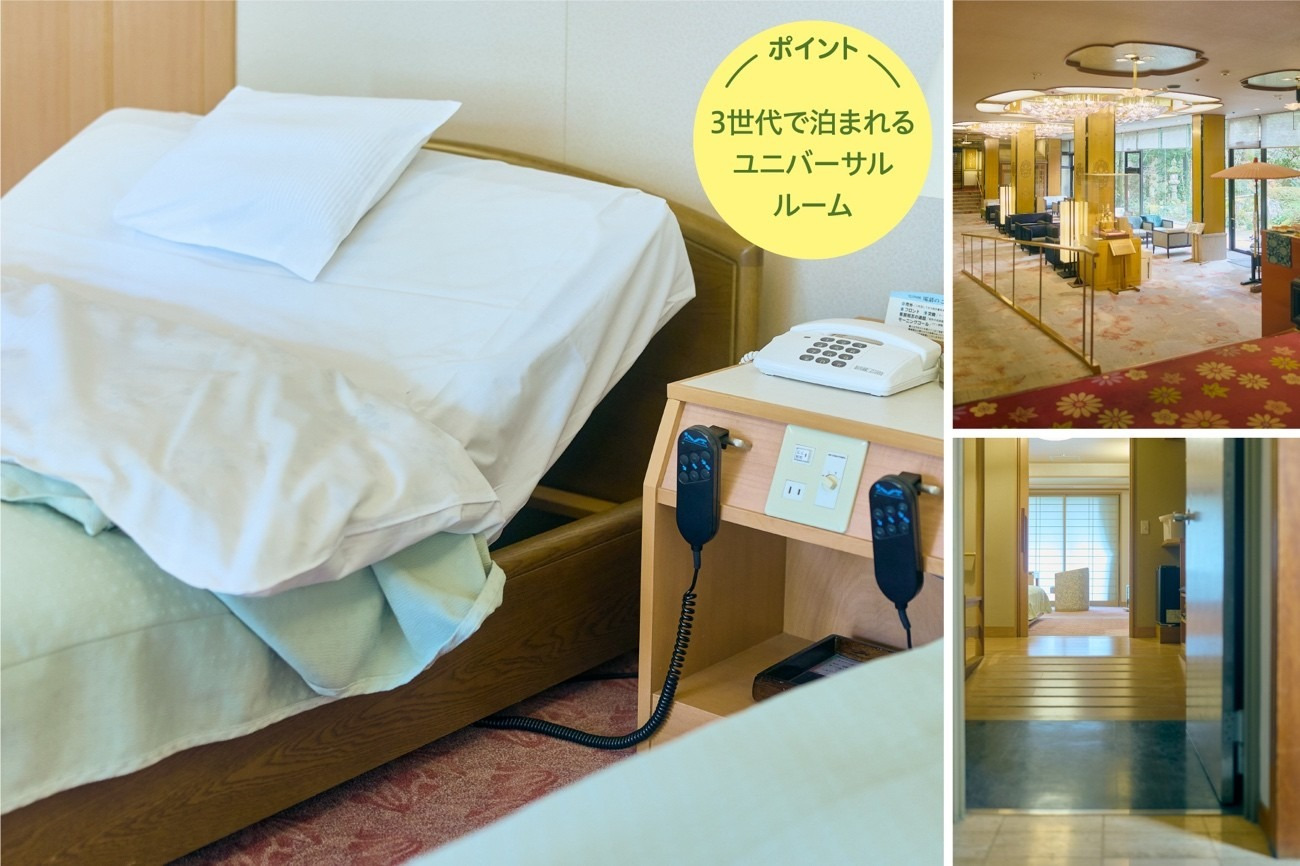 ユニバーサルルームを3室完備するほか、バリアフリー対応の貸し切り風呂もあり。また、館内全体にも手すりや緩やかなスロープを設置し、食事処もテーブル席にするなど、客室以外も人にやさしい造りを目指し、積極的な施設改修が行われている。