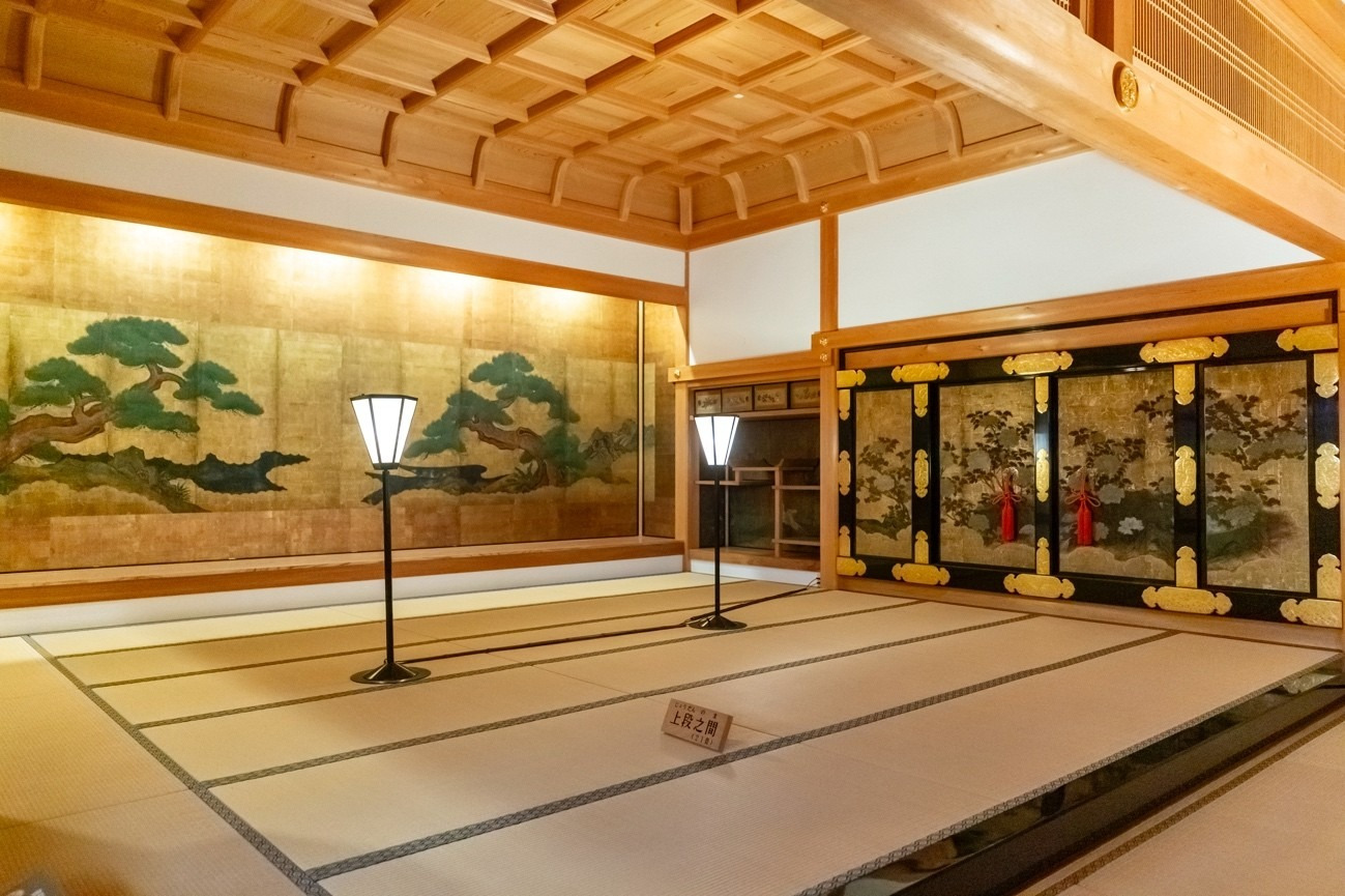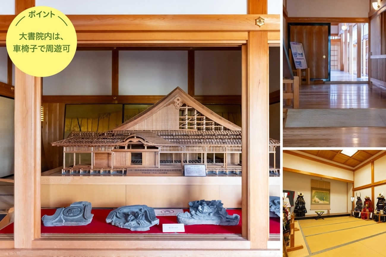 上段の間には狩野派絵師が描いた屏風絵を障壁画として転用するなど、見どころも満載。部屋をぐるりと囲む広縁を車椅子で回ることができる。