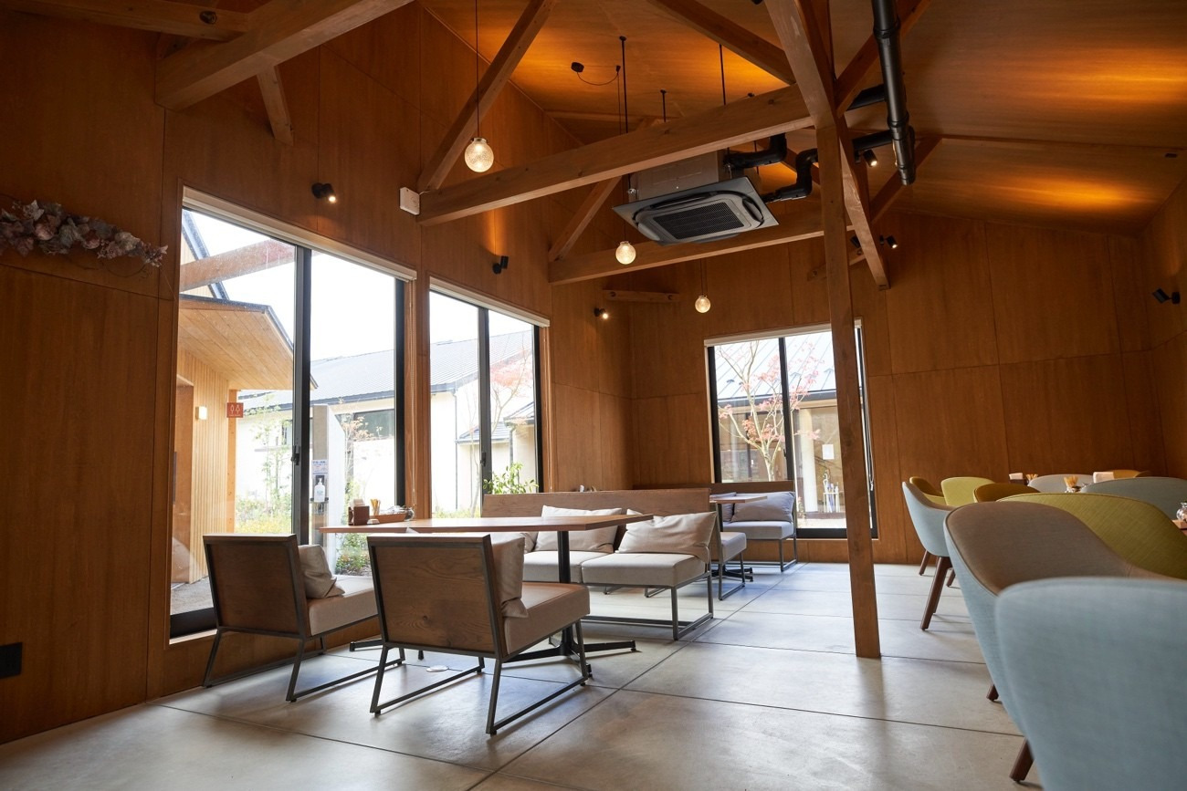バリアフリーなカフェ「Cafe&Bar草山の森」は猪肉など地元でとれた食材を中心としたメニューを提供。窓からの景色を眺めながらゆったりと過ごせる。