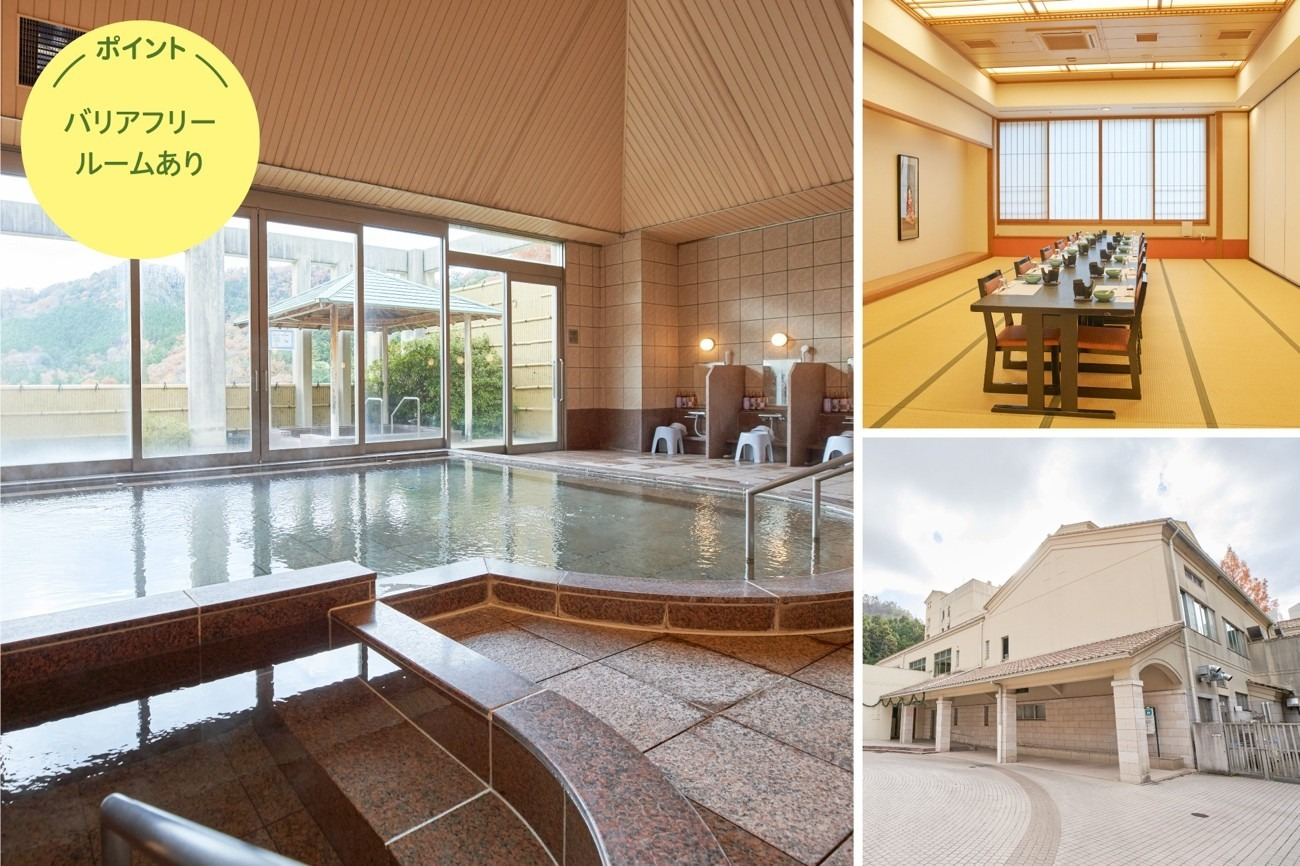 客室は本館に和室や洋室ツイン、別館にはログハウスタイプの洋室などさまざまな部屋タイプを用意し、少人数から団体客まで柔軟に対応。また、猪肉を使った鍋など丹波篠山の味覚を堪能できる料理が好評で、広々とした大浴場も完備。丹波篠山の四季を感じながら、のんびりと過ごして。