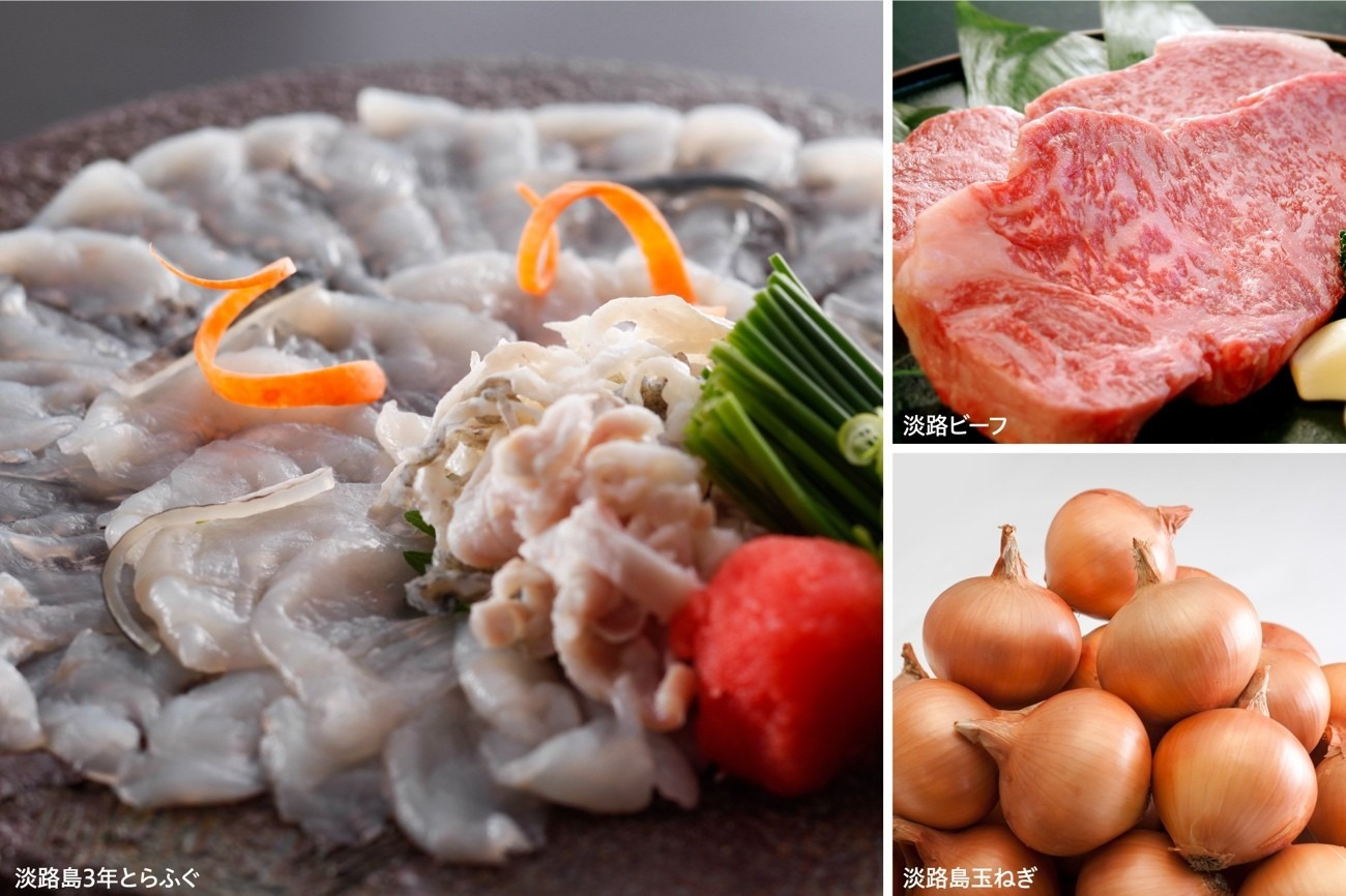 ハモや淡路島3年とらふぐなど鮮度抜群の魚介類、超一級の肉質を誇る淡路ビーフなどの畜産物、淡路島玉ねぎや柑橘といった青果など、季節ごとの旬の美味をぜひ味わって。