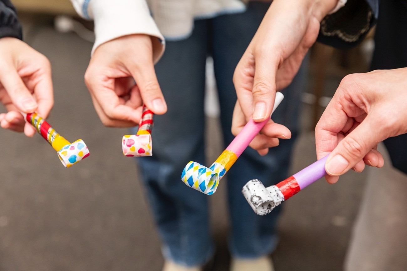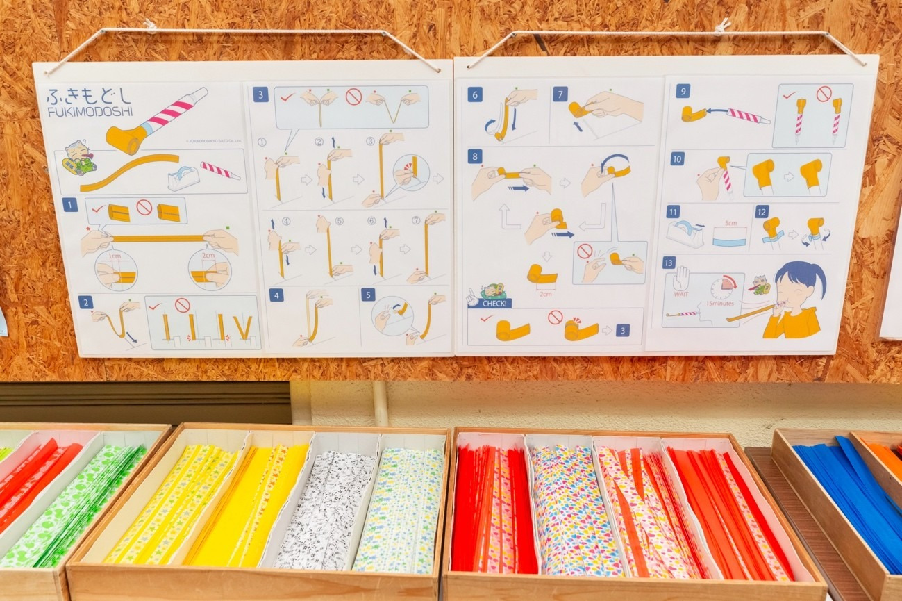 約50種の吹き戻しを購入でき、タマネギ型やハート型など非売品の吹き戻しで遊べるコーナーも。