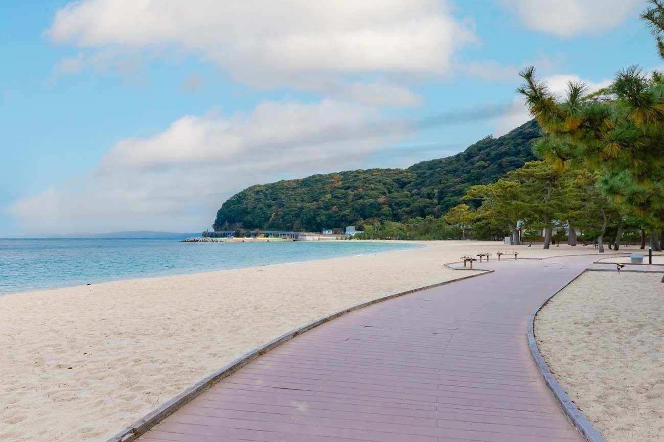 浜辺に千本松と呼ばれる黒松が茂る風光明媚な景色が広がる。約750mにわたって南北に続くビーチには、車椅子でも通りやすいスロープを整備し、ゆったりと散策できる。