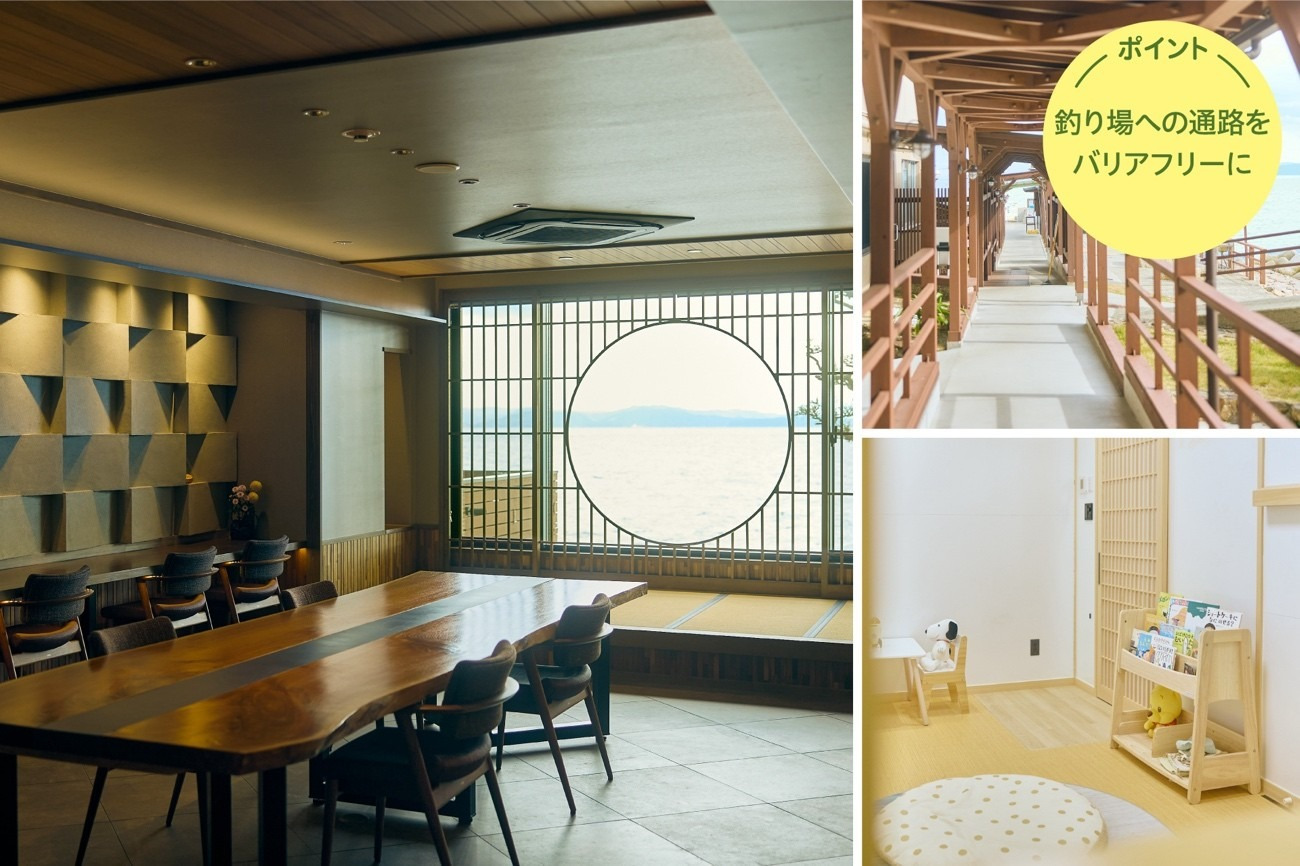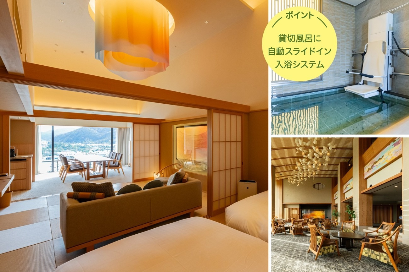 車椅子で入室できる露天風呂付き特別客室はもちろん、全室オーシャンビューの温泉宿。