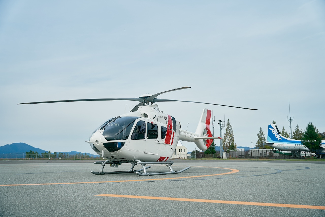 Helicopter ride from Kobe Airport to Tajima Airport. During the ride, you will enjoy an aerial view of Hyogoʼs iconic Takeda Castle Ruins. Upon landing at Tajima Airport, you will be sent to Genbudo Caves by a private car. Together with a private tour guide, you will explore the miraculous natural monument, Genbudo Caves.