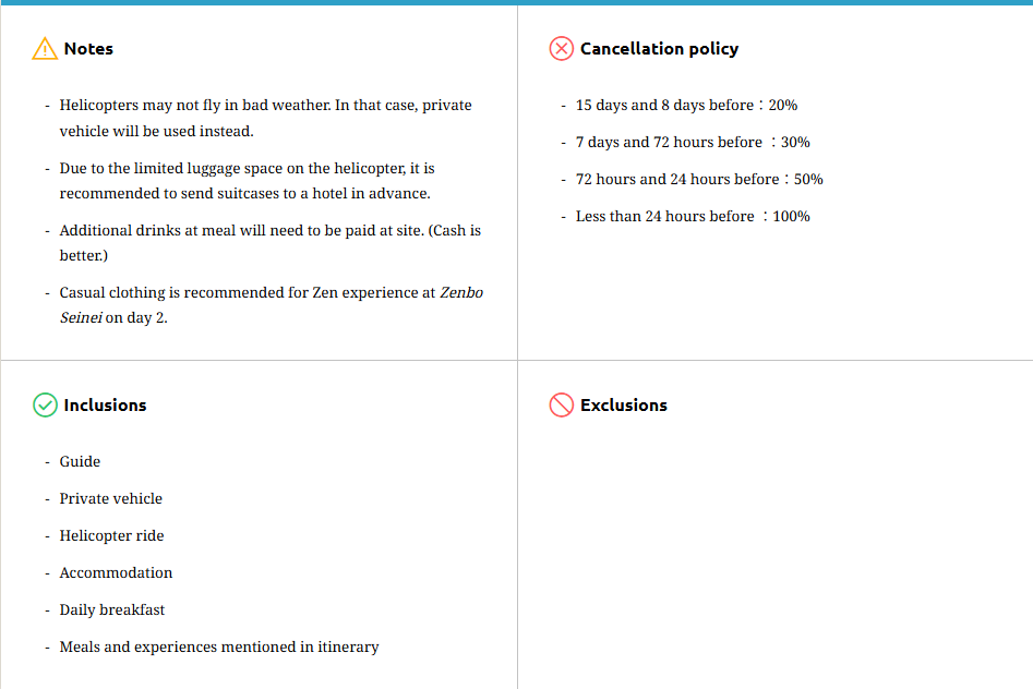 You will fly back by a helicopter looking down at the beautiful scenery of Awaji Island. You will realize time flies so fast, especially when you have great times. This day time flight will show you the glittering blue ocean and mountains with dotted villages and places you have visited. Leave your love and heart to Awaji Island but keep unforgettable beautiful memories with locals in your mind. After the safe landing at the Kobe heliport, your next journey will be continued. Enjoy the rest of your stay in Japan.