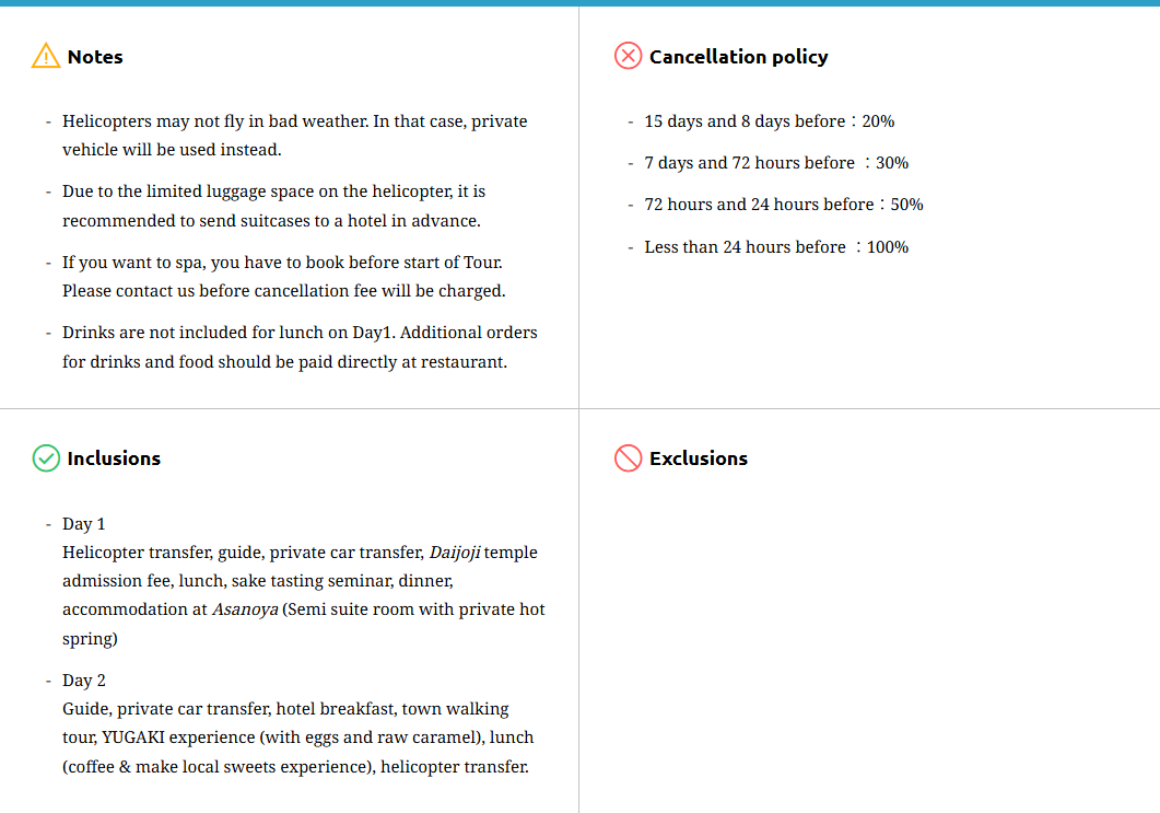 You will fly back by a helicopter looking down at the beautiful scenery of Hyogo. You will realize time flies so fast, especially when you have great times. This day the flight will show you mountains with dotted villages and places you have visited. Please keep unforgettable beautiful memories with locals in your mind. After the safe landing at the Kobe heliport, your next journey will be continued. Enjoy the rest of your stay in Japan.
