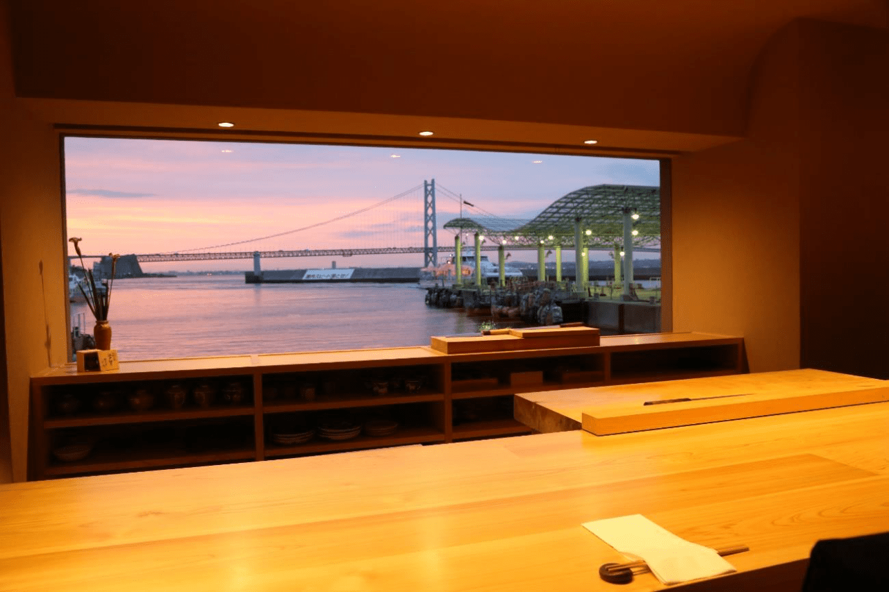 This restaurant is located near the Iwaya Fishing Port, where high-speed boats come and go between Akashi and Awaji Island. With the Akashi Kaikyo Bridge stretching out before your eyes, you can immerse your senses in sushi made with fresh, local seafood from Awaji Island in a space with an ocean view that looks like it should be a painting.