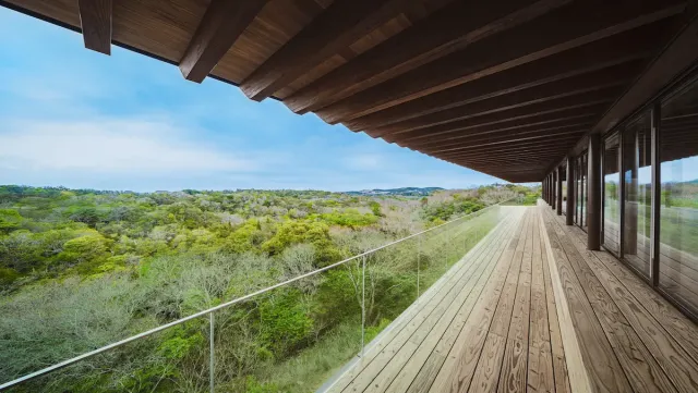 The mainly wooden building makes abundant use of Japanese cedar, particularly the 100-meter-long wooden deck. Walking barefoot on the deck, you can feel the warmth and fragrance of the wood.