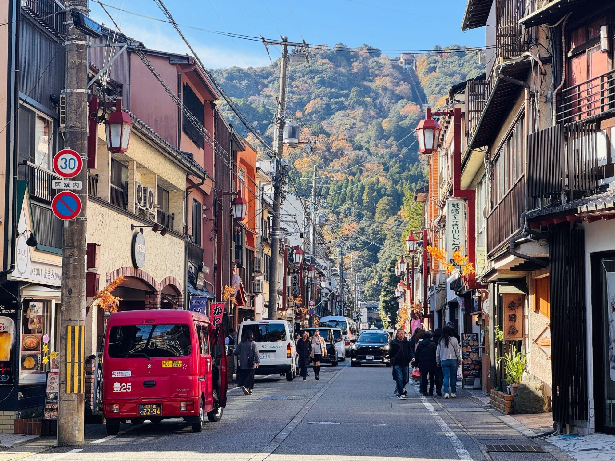 To see Kinosaki from a different perspective, the Kinosaki Onsen Ropeway ascends Mt. Daishi above the town. The short ride reveals a layered landscape: the river winding through the town, rows of wooden buildings forming a classic onsen silhouette, and beyond them, rolling mountains and the distant shimmer of the Sea of Japan.