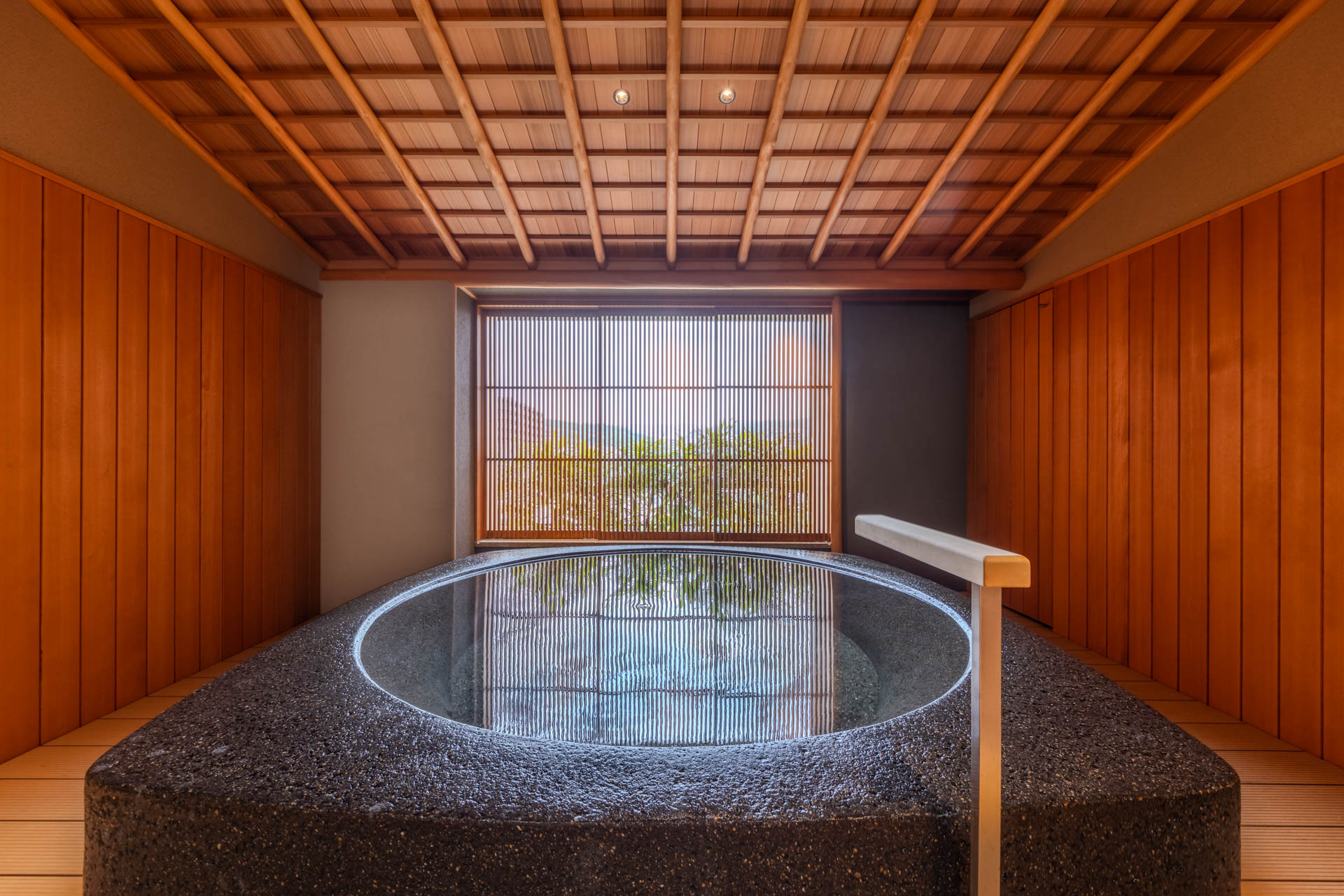 Inside the ryokan, visitors encounter classic elements of Japanese design that cultivate a sense of calm. One distinctive feature is Mizugoto, a form of sonic hospitality installed throughout the lobby and various indoor spaces. Inspired by the principle of the traditional suikinkutsu, this acoustic device resonates the sound of water droplets within a buried ceramic vessel, creating clear, delicate tones. Evolved for indoor settings, it reinterprets a classical form of auditory play and relaxation rooted in Japanese tradition. Each note that gently echoes through the space embodies the aesthetic sensibilities, spirituality, and philosophy of harmony with nature that lie at the heart of Japanese culture.