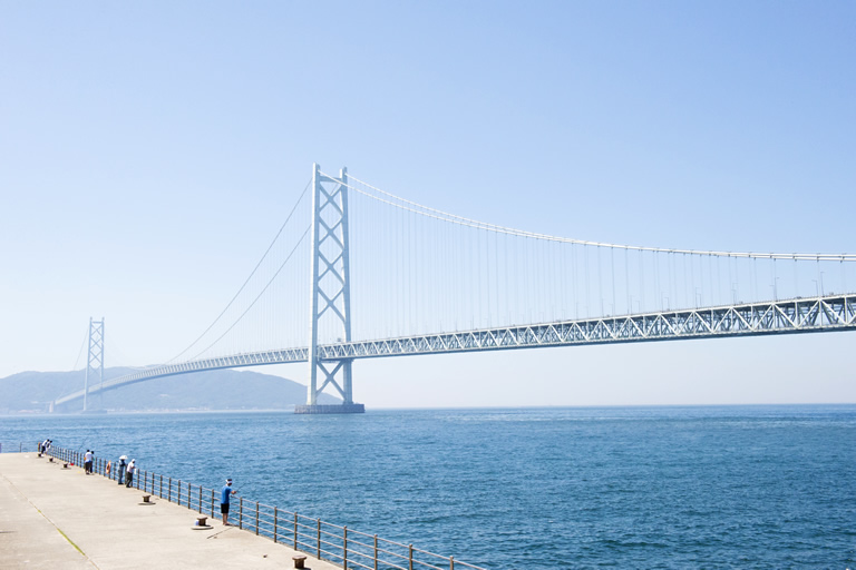 魚の棚商店街でお腹を満たしたら、明石海峡大橋へ。車を走らせていると、車窓から大きなつり橋が見えてくるはずだ。明石海峡にかかる全長3911mのこの橋は、つり橋としては世界第2位の長さを誇る。
