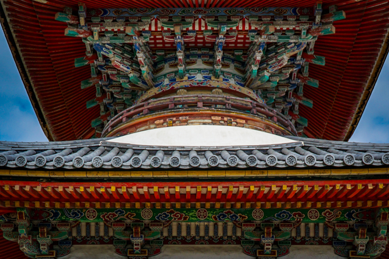Even though it is beautiful from a distance, its beauty of decorative patterns painted in extreme colors and the architectural style of the tower itself are even more striking iwhen seen from up close. It looks really impressive when viewed from a slightly lower angle too! The rhythmically lined wood and painted patterns are fantastic, and it is easy to see why it is called "the most beautiful pagoda".