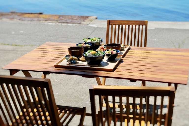 I went for the most popular item on the menu, the "Fish Lunch," which featured freshly caught braised sea bream from local fishermen. The meat was so tender that it almost melted in my mouth, and the lightly soy-flavored braise complemented the taste. There were several side dishes, too, such as flounder sashimi, freshly caught whitebait, some seaweed, and local veggies carefully prepared homemade. Honestly, this lunch is my new comfort food – it made me so relaxed I almost fell asleep under the parasol!