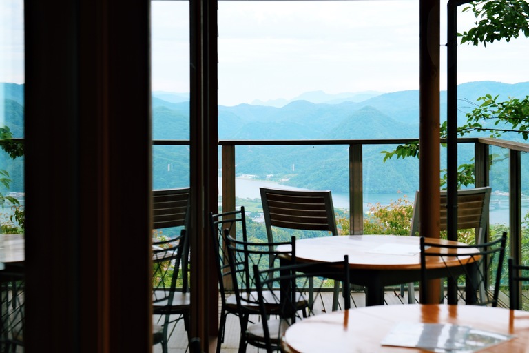 Panoramic seats at the Kinosaki coffee Miharashi Terrace Café